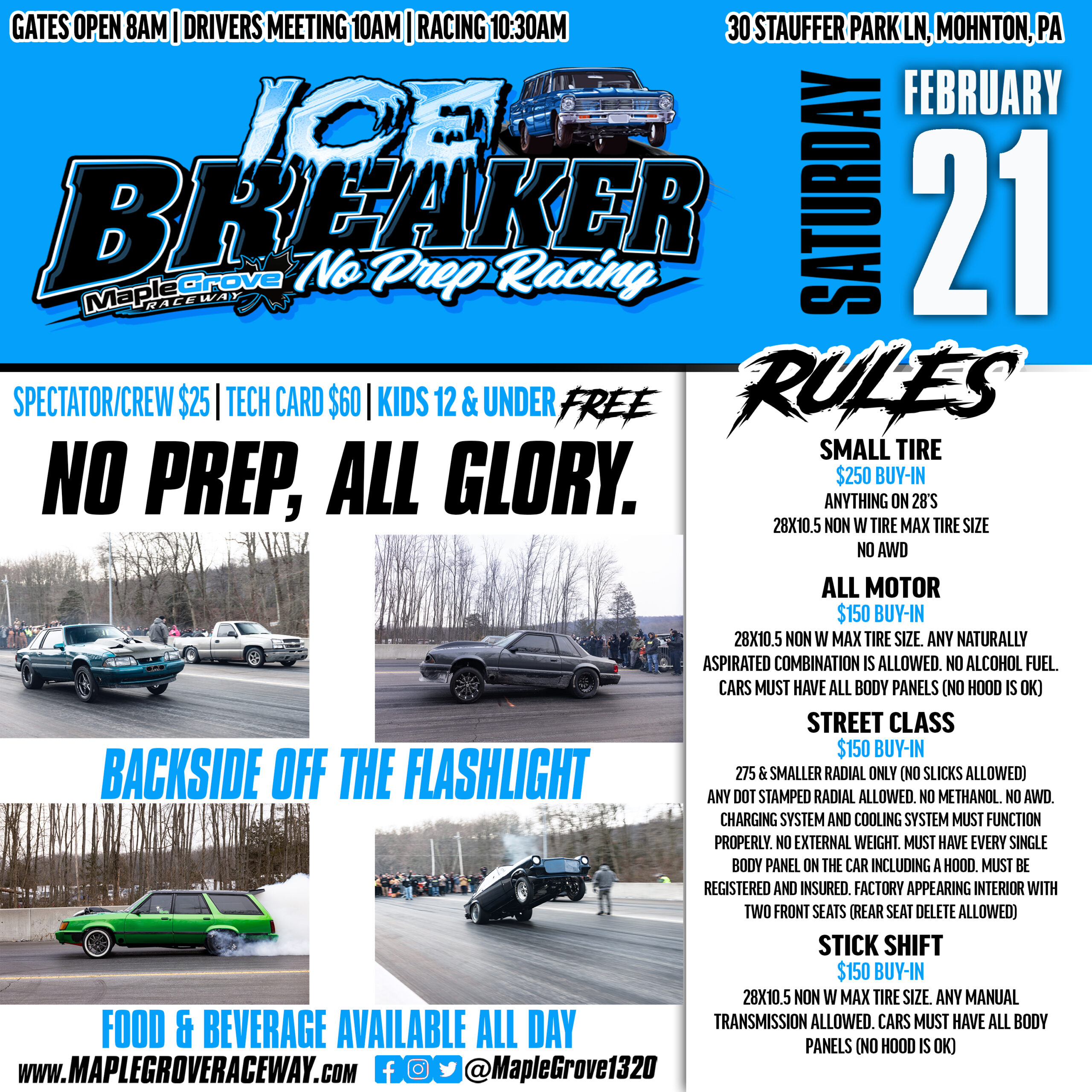 New for 2026 Ice Breaker will be contested on the backside of Maple Grove Raceway. Come see the same classes contested at New Years at the Grove! Racing off the flashlight.