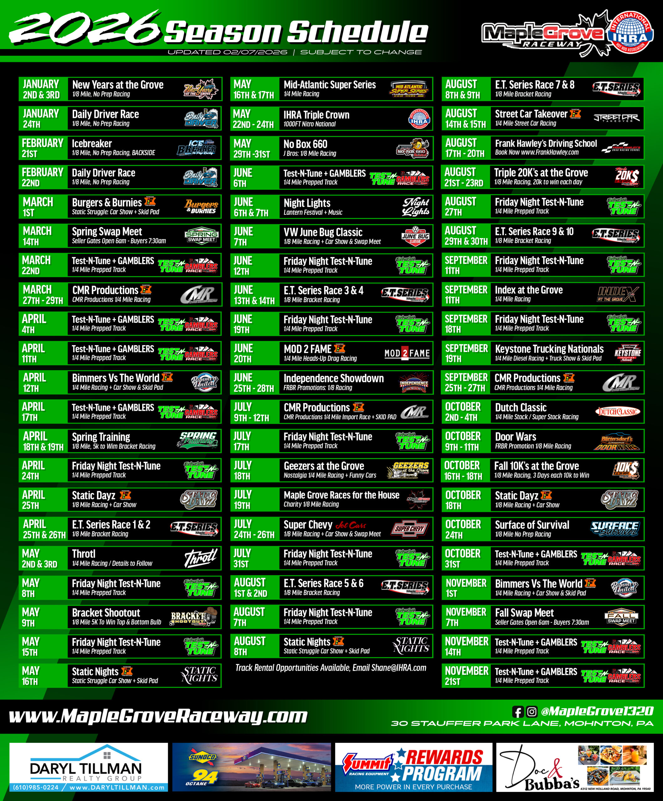| Date: 05/15/2026 Friday | Event Name: Test N Tune | Gate Opens: 4:00 pm | View Details |